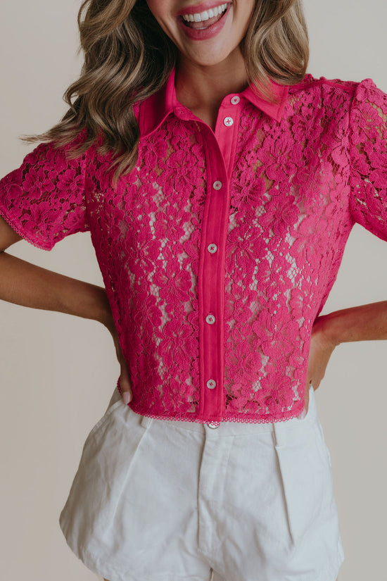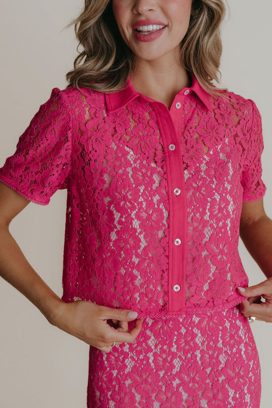 Discover the Beckett Blouse by LaRoque, a charming piece shown in delicate Pink Lace. This cropped blouse features a beautiful lace shell overlay, a collared V-neckline with a classic button placket, and a flattering cropped fit that pairs perfectly with high-waisted bottoms.