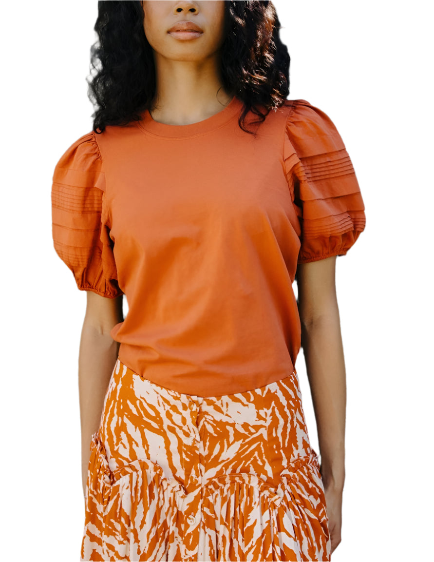 Add a bold twist to your everyday wardrobe with the Dylan Top by Love the Label. Featuring sculptural pintuck puff sleeves and a vibrant hue, this elevated tee blends effortless comfort with standout style. Perfect on its own or layered under a blazer, it’s your new go-to for casual days that still call for something special.