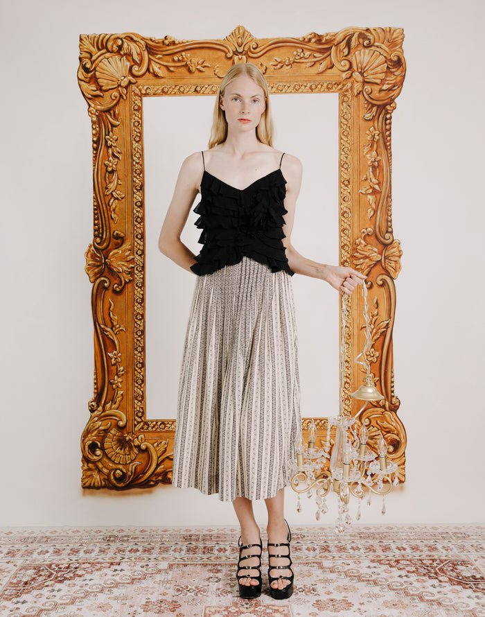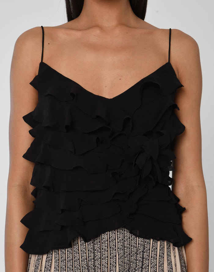 The Elio Top blends romance and sophistication, featuring soft black ruffles and a raw-edge chiffon flower appliqué at the waist. Its textured design adds depth while maintaining an effortless elegance.