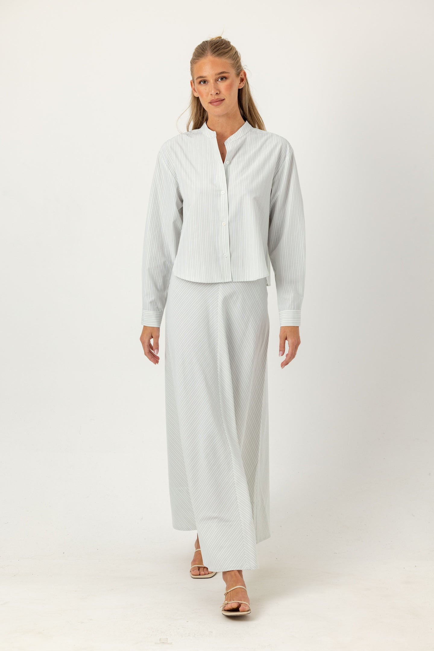 Meet the Sadie Shirt by We Are Sundays—your new go-to for effortless elegance. With a classic, architectural silhouette, this top features clean modern lines, a mini stand collar, and pleated back detail that adds just the right amount of movement. The slightly cropped length sits perfectly with high-waisted skirts or trousers, while pleated cuffs on the long sleeves give it a crisp, tailored finish. Polished, chic, and endlessly versatile.